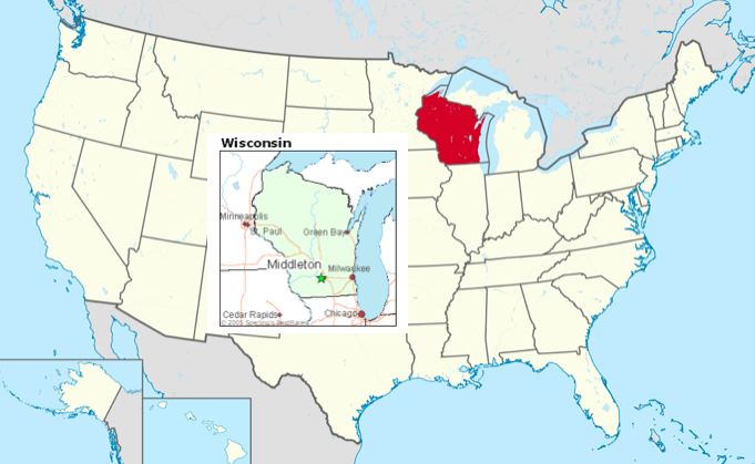 Il Wisconsin è situato nella regione dei Grandi Laghi, con i quali confina a nord con il Lago Superiore e ad est con il Lago Michigan; sempre a nord confina anche con lo stato del Michigan, a sud con lo stato dell’Illinois, a Ovest con Iowa e Minnesota; la capitale è la città di Madison, situata a circa 6 miglia (circa 10 chilometri) da Middleton.